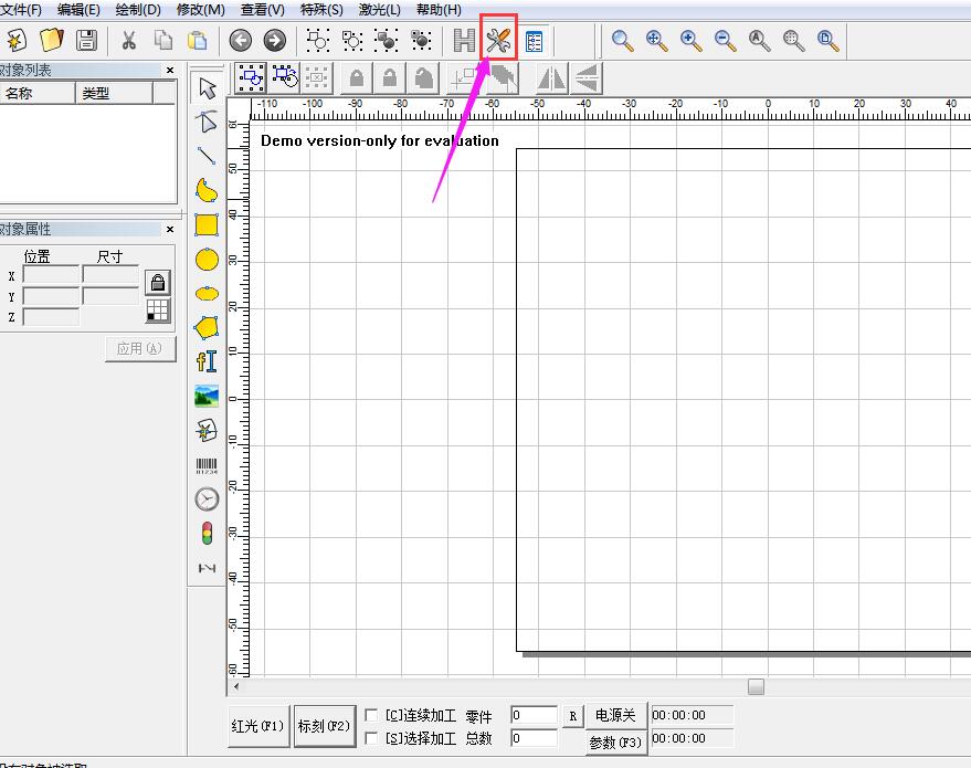 1.我们将激光打标机软件打开,在软件界面上找到激光打标机工具栏,如下图: