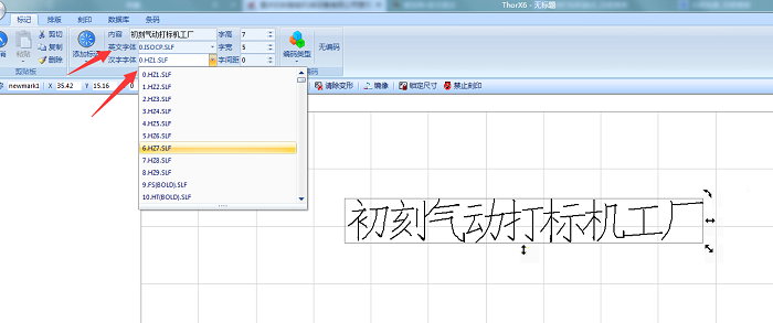 气动打标机字体怎么改?在建立好气动打标机标记后,首先选中需要更改字体的内容,点击左上角“英文字体”或者“汉字字体”,可选择系统内自带的上百种字体,可以立即看到更改效果。