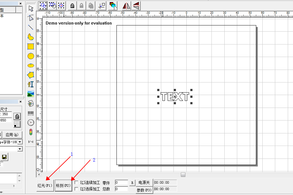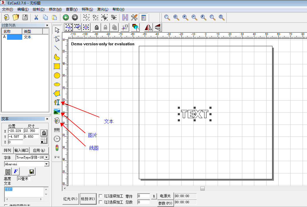 我们打开激光打标机软件后,我们找到文本编辑,图片编辑,线图编辑等位置,在下图箭头指示区域。