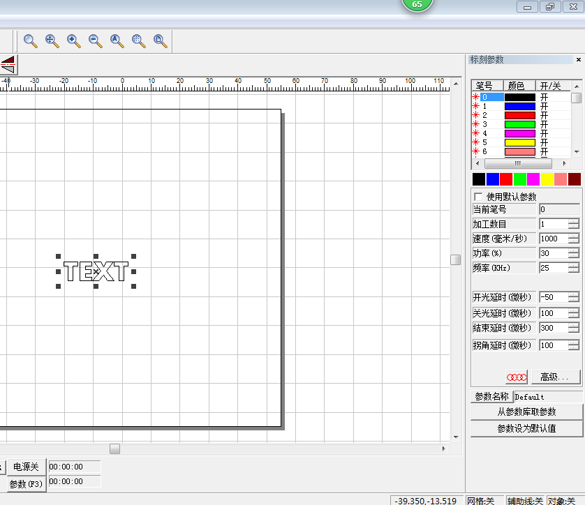 我们根据我们的要求将文本编辑好后,在软件的右边有激光打标机参数调节区域,