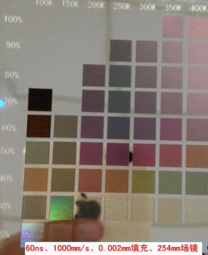 打标条件:在254mm场镜下使用6ns、1000mm/s固定参数,调节频率、功率以及填充密度标刻6*6mm方块打彩