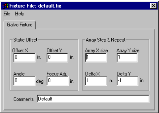 X偏移值及Y偏移值用来偏移与固定文件相链接的所有文件中的所有目标对象的X/Y位置。这一位置是对每一个对象所定义的绝对位置的偏移量,这一功能用于补偿固定偏移量。例如,一个其中心定义在打标区域中心的单个部件,由于某种原因,工件夹具被安装为其中心与打标区域中心相比向右偏0.1"及向下偏0.2"。这时可将偏移值设为X=+0.1"及Y=-0.2"作为补偿,从而代替重安装工件夹具。当单步/重复被利用时,队列中的第一部分被定位于编辑对象的X/Y绝对位置,后面队列的位置与这些点相距一个步距。利用注册功能来设置整个队列的偏移量。
