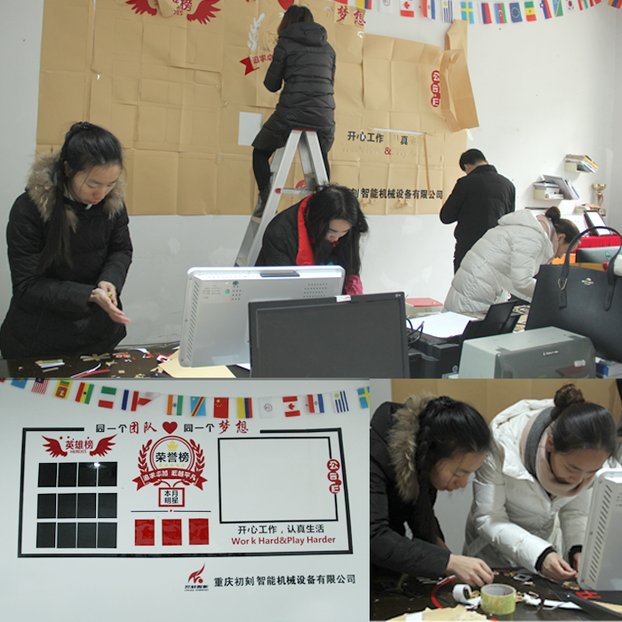 2019如期而至,初刻打标机公司的小伙伴们依旧团结,携手并进!初刻大家长订购回一些新素材,公司内外贸部小伙伴一起动手装点墙面,一字一字裁剪装点,你出一点力我出一点力,仅一天的时间,销售部、装配车间、生产车间、会议室以及大家长的办公室墙面都焕然一新,新年新气象,我们为了同一个梦想而凝聚、为了同一个目标而奋斗,团结永远是力量,大家盛着欢喜心去做一件事,一群人一件事一起拼一定赢!