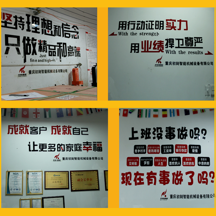 这是初刻打标机公司大家长对每个小伙伴的寄望,墙上的标语也是我们共同的期许——同一个团队同一个梦想、用行动证明实力、坚持理想和信念,只做精品和高端、成就客户成就自己,让更多家庭幸福...这不正是我们的企业目标吗?