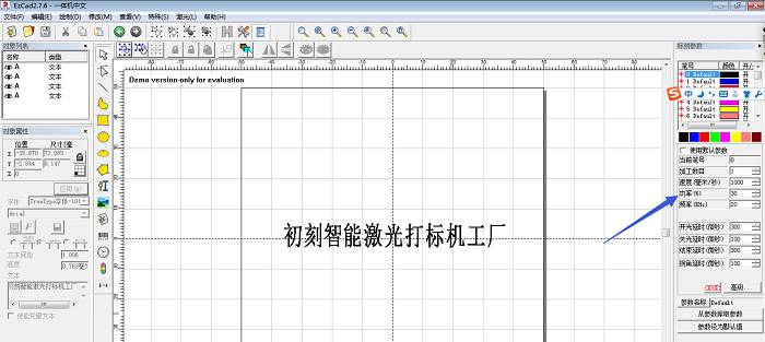点击左边工具栏”FI"项,修改内容后点击应用,然后在右边的参数框内修改功率、和速度等参数。